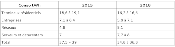 Les transformations massives en cours (croissance des usages vidéo, « numérisation de l’économie », « plate-formisation », etc.) ne semblent pas se traduire dans l’énergie dépensée. Un constat qui s’expliquerait par les gains en efficacité énergétique, et par le fait que la progression de la consommation des smartphones et centres de données a été compensée par le déclin des télévisions et des PC. Ces conclusions optimistes méritent toutefois un examen plus approfondi.