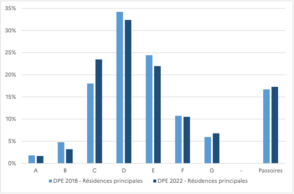 En France, ce dernier compte pourtant encore 36 % de chaudières au gaz et 26 % au fioul. Seuls 5 % des résidences principales sont classées en étiquette A ou B en 2022, et le nombre de logements mal isolés demeure considérable (39 % des logements en étiquettes E, F et G).